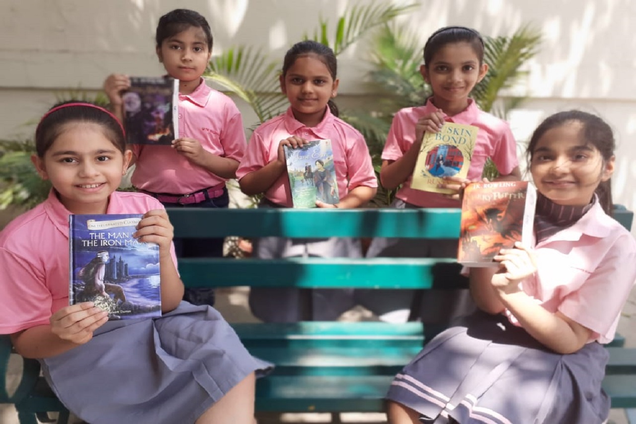 Niranjana students showcasing their favourite books on World Book Day