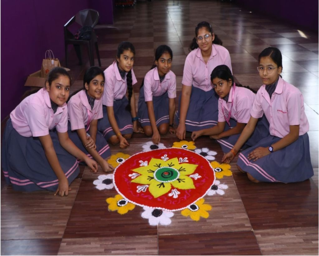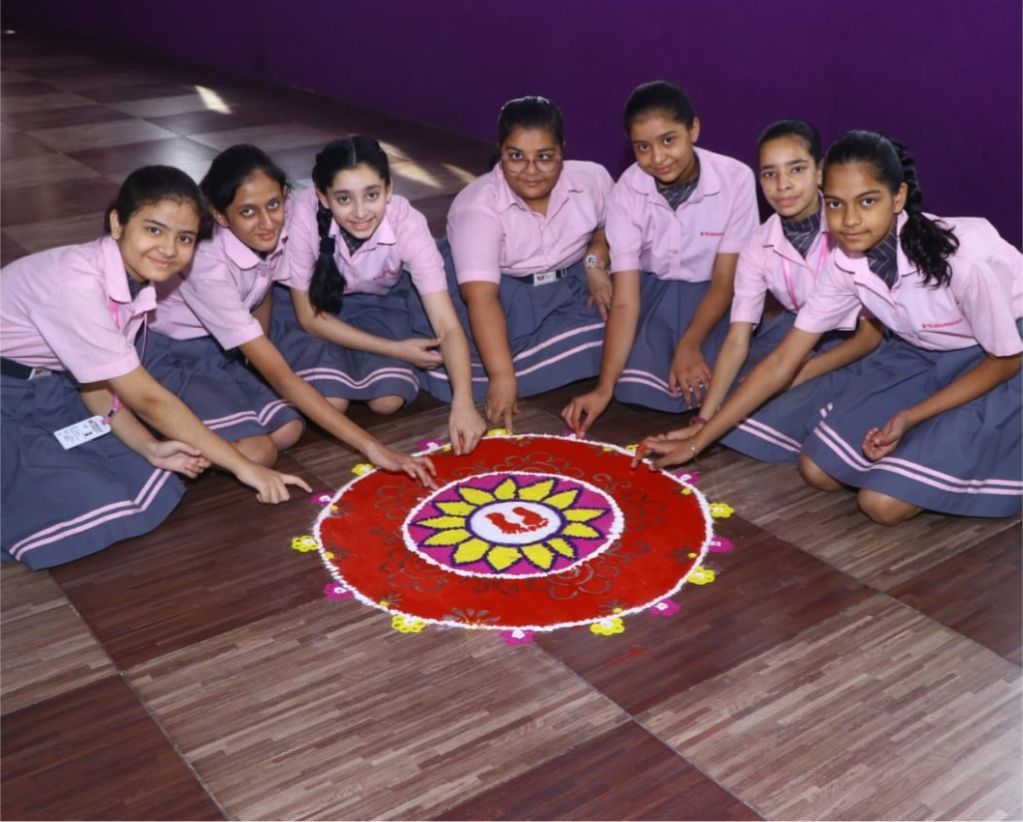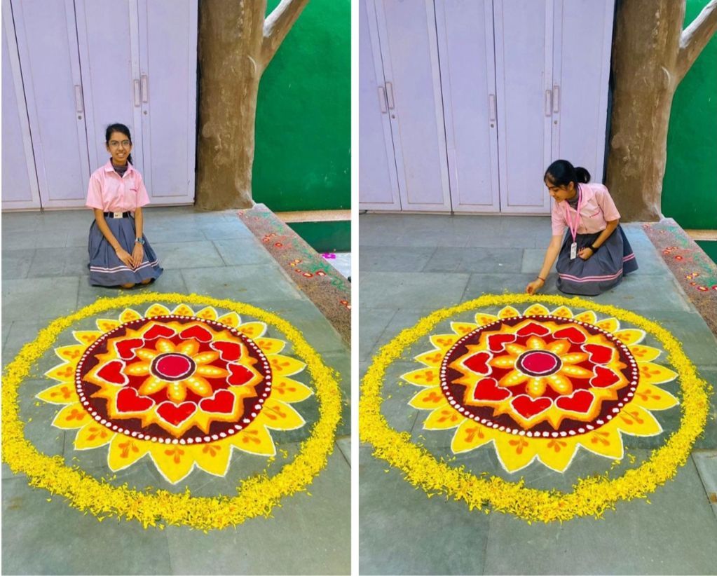 On the second day, under the guidance of the Art teacher, Miss Mansi Bhandari, students showcased their creativity by crafting vibrant rangolis using flowers and dry colours. These beautiful creations not only adorned the school but also served as picturesque backdrops for students and teachers capturing memorable moments. The celebration culminated with smiling faces and an atmosphere brimming with festive wishes, underscoring the importance of cultural festivities in fostering unity and happiness within the school community.